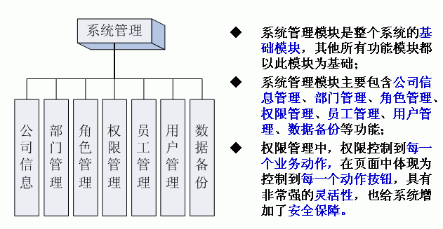 系統(tǒng)管理模塊主要包含公司信息管理、部門管理、角色管理、權(quán)限管理、員工管理、用戶管理、數(shù)據(jù)備份等功能;