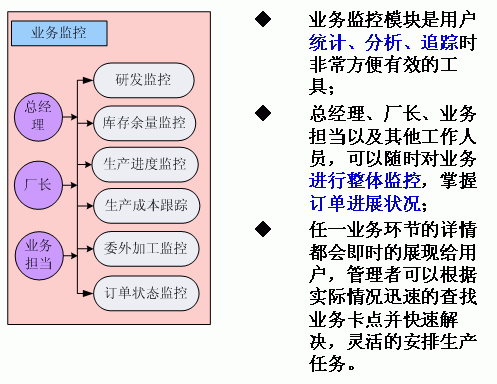 總經(jīng)理、廠長(zhǎng)、業(yè)務(wù)擔(dān)當(dāng)以及其他工作人員,可以隨時(shí)對(duì)業(yè)務(wù)進(jìn)行整體監(jiān)控,掌握訂單進(jìn)展?fàn)顩r;