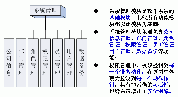 系統(tǒng)管理模塊主要包含公司信息管理、部門管理、角色管理、權(quán)限管理、員工管理、用戶管理、數(shù)據(jù)備份等功能;